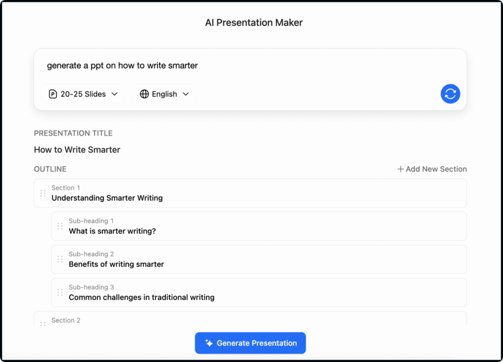 Once you’ve specified the core topic of your presentation and the total slide count, simply engage the blue arrow icon. This action launches a powerful AI agent that instantly produces a detailed structural blueprint for your slides.