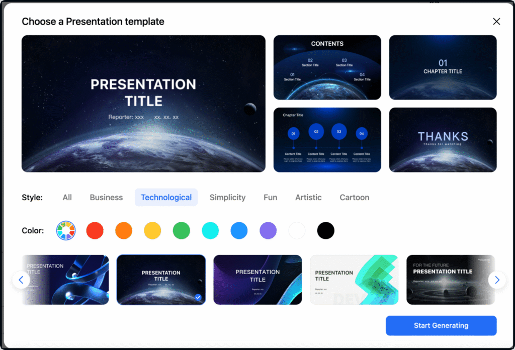 Once your presentation’s outline is complete, click the “Generate Presentation” button below and choose one of the many expertly created templates. Additionally, pick the color of the template style that you have chosen. For many industries, such as business, technology, minimalism, fun, art, and cartoon, there are several template styles available.